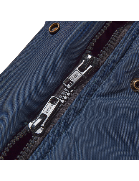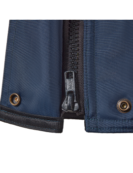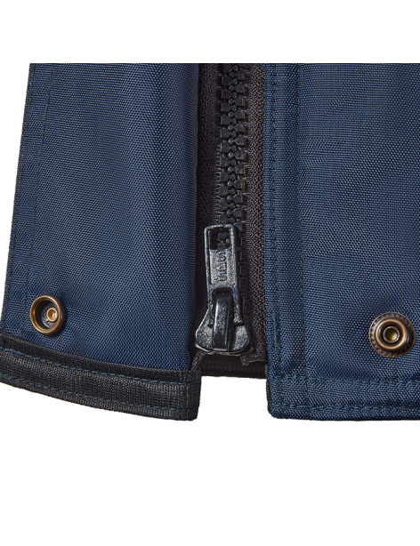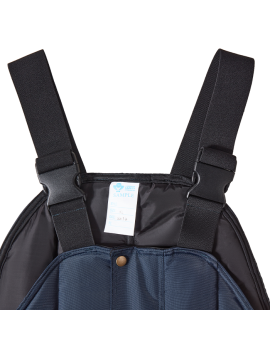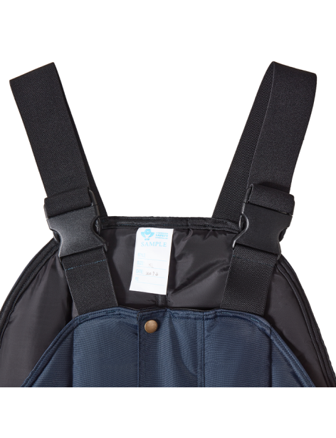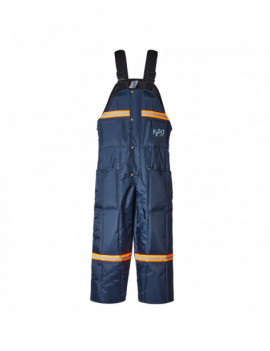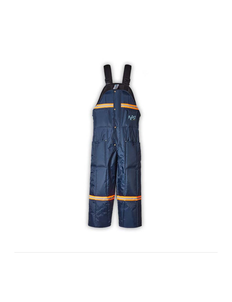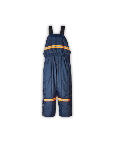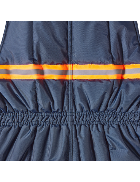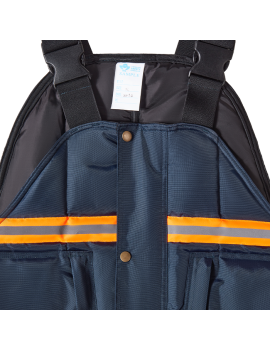 PERFORMANCE FEATURES: 2 way heavy duty front zipper with storm flap snap closure. 2 way heavy duty side zippers and snaps for easy in/out legs. 4 insulated pockets: 2 large zipper chest pocket, 2 lower oversized pockets. Contrast orange/reflective trim for increased visibility and safety. Quick release suspender straps.