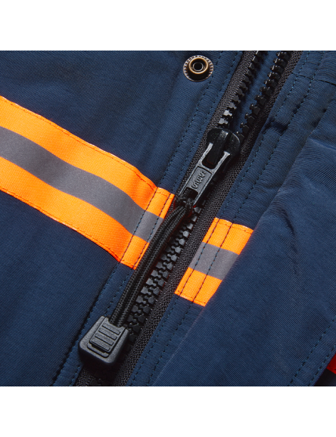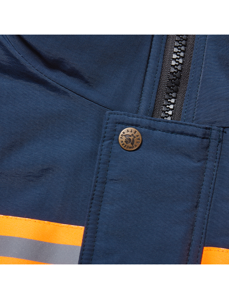 PERFORMANCE FEATURES: Heavy duty zipper with storm flap snap closure. Contrast orange/reflective trim for increased visibility and safety. 6 pockets total: 2 upper left sleeve. 2 lower flap pockets. Rib-knit cuffs. Adjustable waist with drawstring stoppers. Hood snap connection available (FH-40).