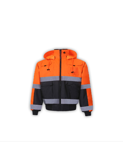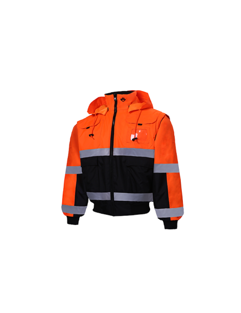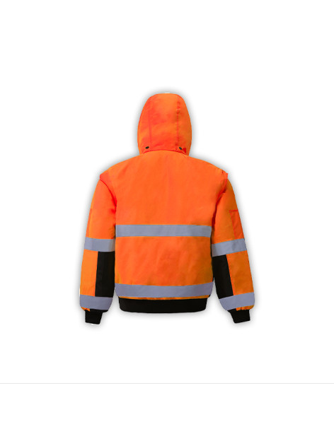 PERFORMANCE FEATURES: 2" wide reflective stripes. Heavy duty zipper front closure. Rib knit waistband and cuffs. Detachable sleeves and hood wiht drawstring and stoppers. Reversible: Black interior. 9 pockets total: 1 chest flap pockets, 1 chest pocket with ID badge holder, 1 left sleeve pen/tool pocket, 2 handwarmer pockets, reverse side: 2 slash pockets, 2 chest pockets.
