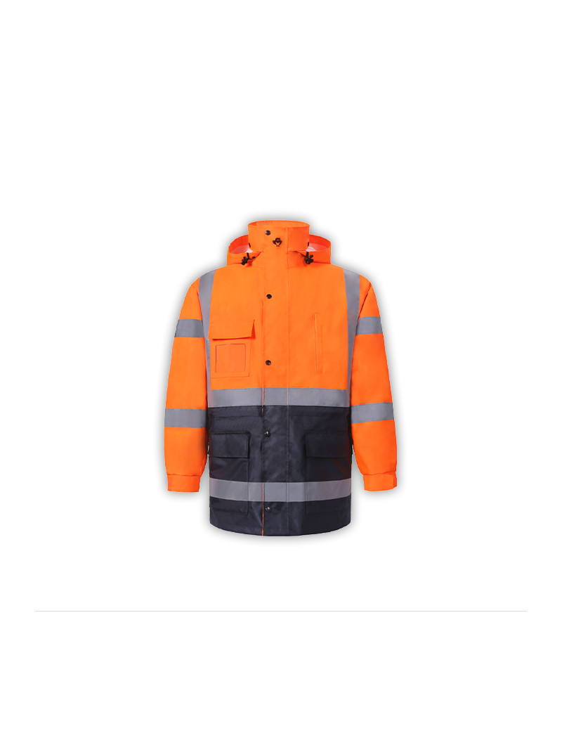 PERFORMANCE FEATURES: 2 wide reflective stripes. Heavy duty zipper front and storm flap snap closure. Adjustable hook and loop strap on wrist cuffs. Hard hat friendly attached hood with adjustable. drawstring and stoppers. 4 pockets total: 1 clear ID pocket, 1 chest pocket with zipper, 2 pockets with hook and loop closure.