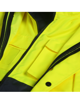 PERFORMANCE FEATURES: 2 wide reflective stripes. Heavy duty zipper front and storm flap snap closure. Adjustable hook and loop strap on wrist cuffs. Hard hat friendly attached hood with adjustable. drawstring and stoppers. 4 pockets total: 1 clear ID pocket, 1 chest pocket with zipper, 2 pockets with hook and loop closure.