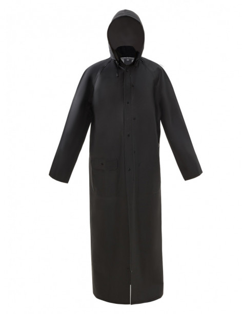 PERFORMANCE FEATURES: Long rain coat with unisex closure, detachable hood, storm-fly front with duracon snaps, and full corduroy collar for extra comfort. Coat has one outside flap pocket, one inside pocket, and cape ventilated back. Snaps on lower legs to prevent flapping.