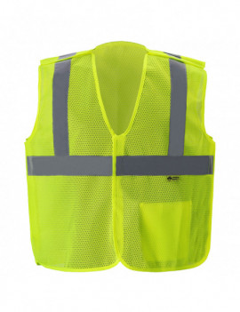 PERFORMANCE FEATURES: Zipper front closure. 2 wide reflective stripes. 4 pockets total: 2 pen/tool pocket, and 2 lower pockets for tools.