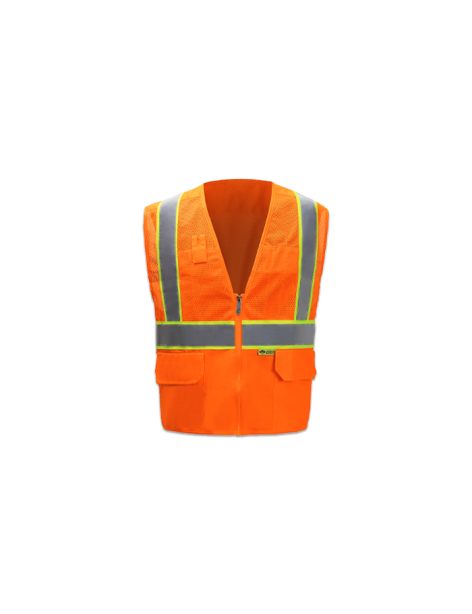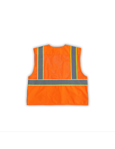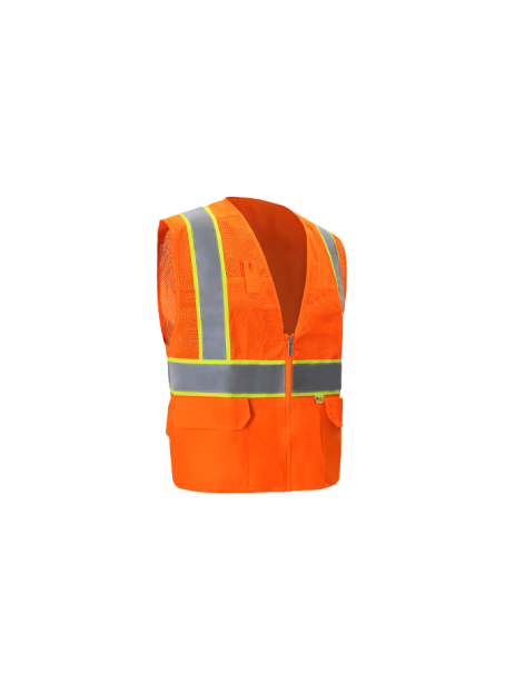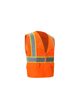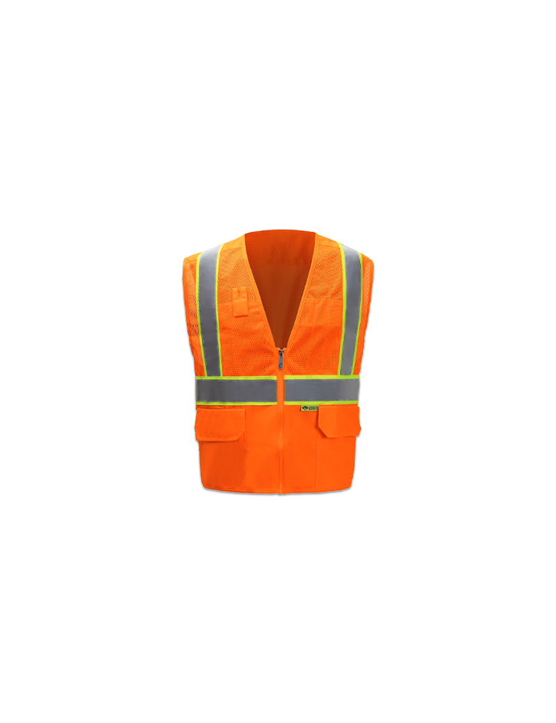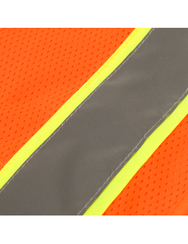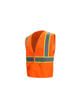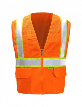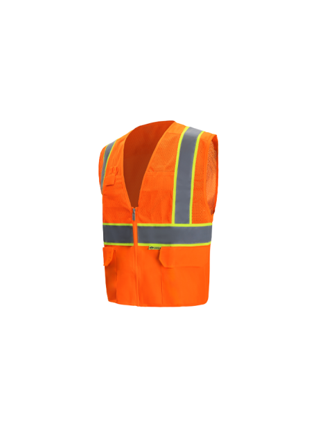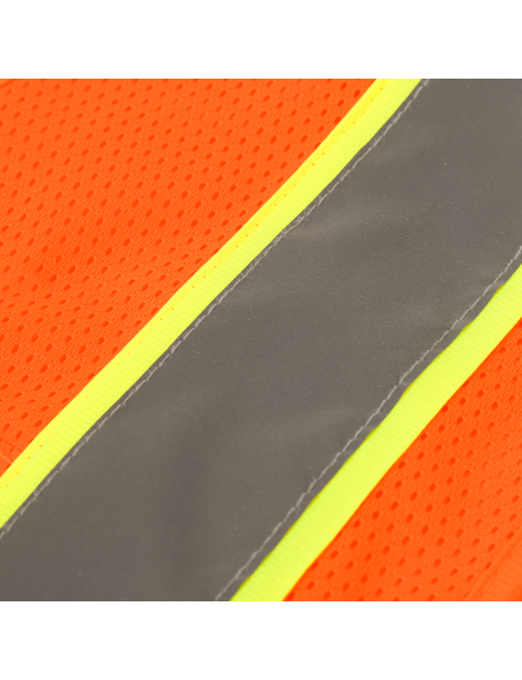 PERFORMANCE FEATURES: Zipper front closure. 2 wide reflective stripes. Mesh upper body and solid lower body. 4 pockets total: 1 pen/tool pocket, 1 cell phone pocket and 2 inside pockets.