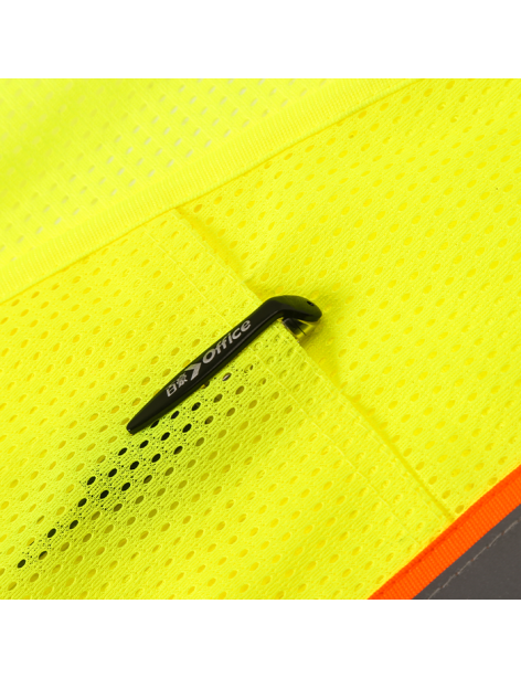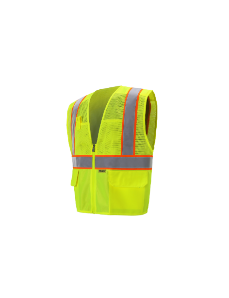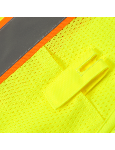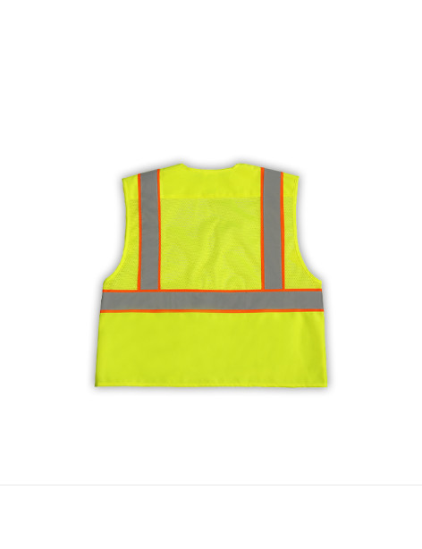 PERFORMANCE FEATURES: Zipper front closure. 2 wide reflective stripes. Mesh upper body and solid lower body. 4 pockets total: 1 pen/tool pocket, 1 cell phone pocket and 2 inside pockets.
