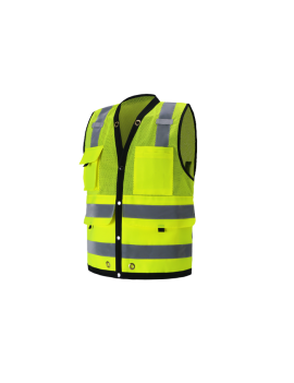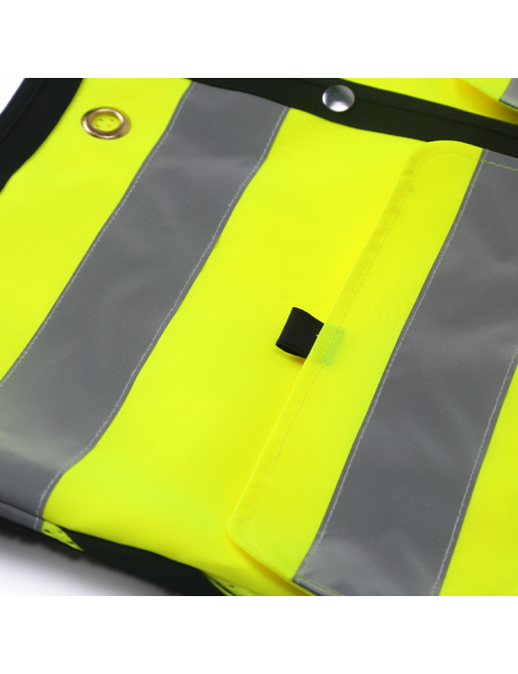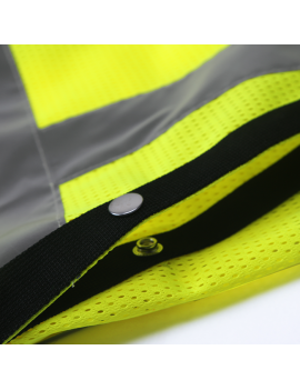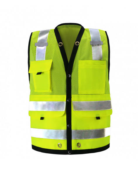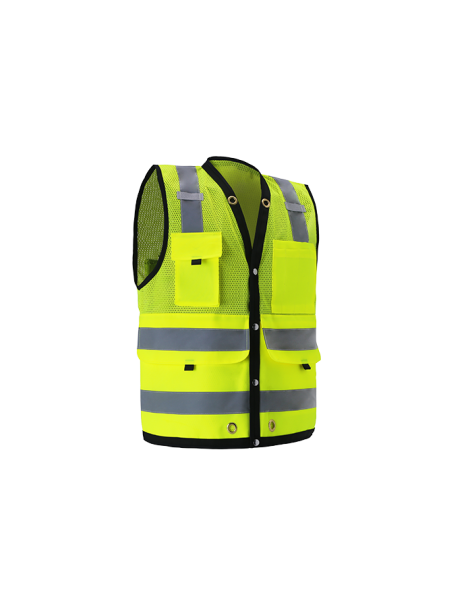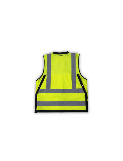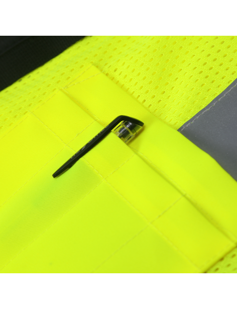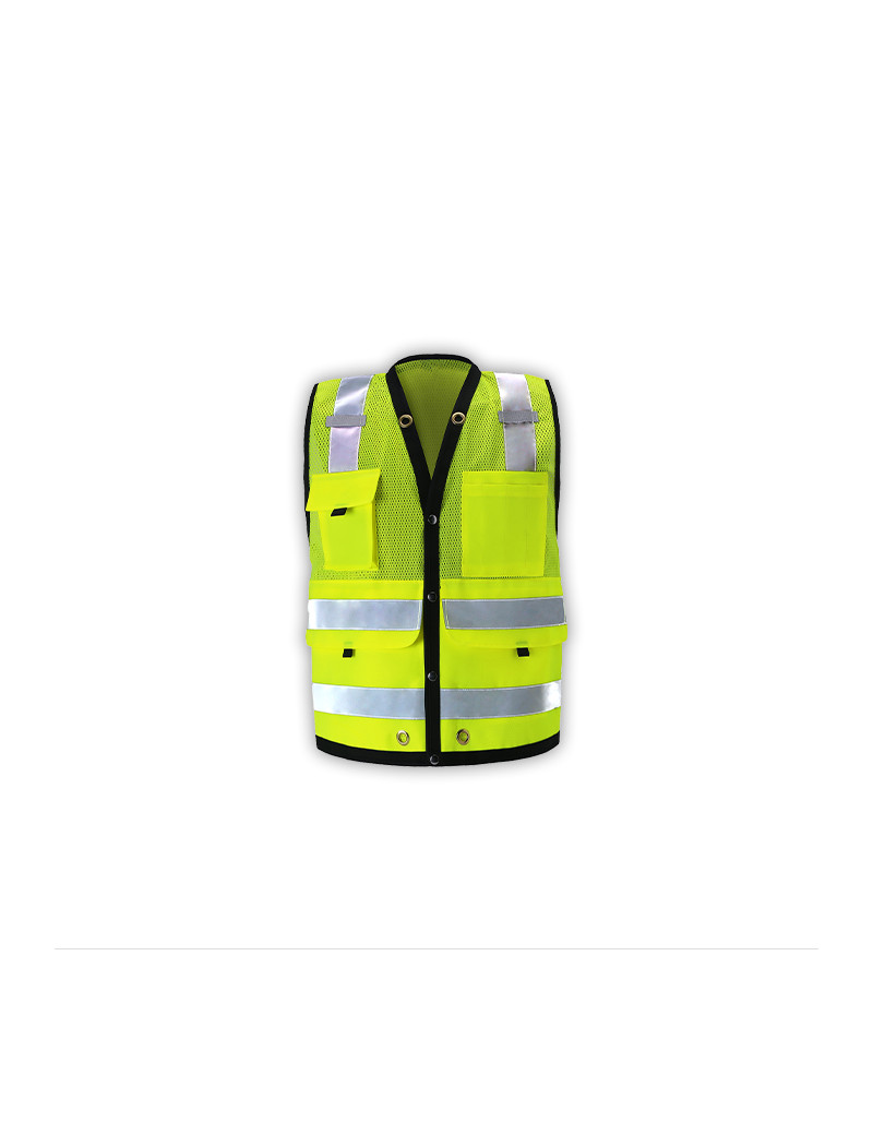 PERFORMANCE FEATURES: Snap front closure. 2 wide reflective stripes and black piping. Grommets at neck and pockets for tools and lanyard. 7 pockets total: 1 pen/tool pocket, 1 radio/cell phone pocket, 1 large back pocket for map book with snap closure, 2 large front utility pockets, and 2 large inside pockets.