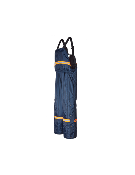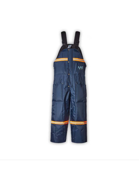 PERFORMANCE FEATURES: 2 way heavy duty front zipper with storm flap snap closure. 2 way heavy duty side zippers and snaps for easy in/out legs. 4 insulated pockets: 2 large zipper chest pocket, 2 lower oversized pockets. Contrast orange/reflective trim for increased visibility and safety. Quick release suspender straps.