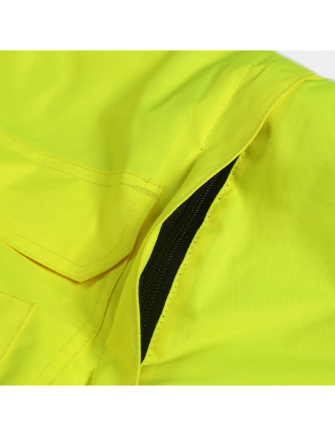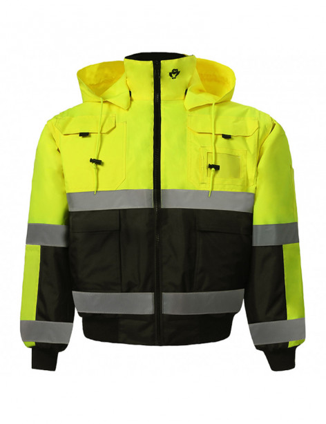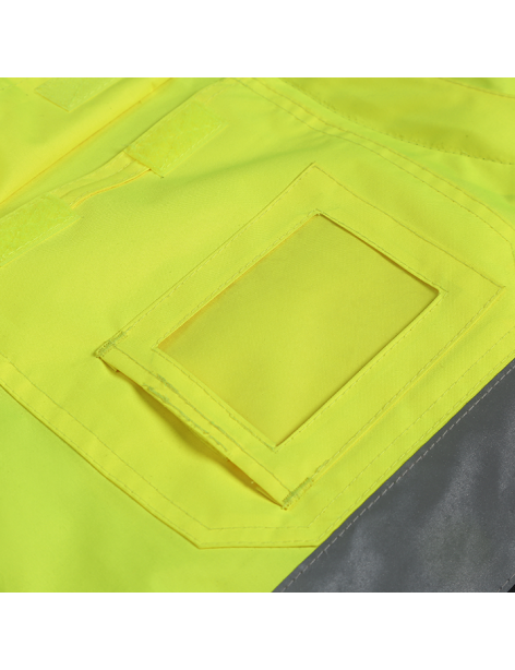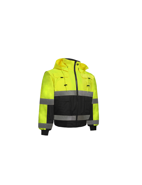 PERFORMANCE FEATURES: 2" wide reflective stripes. Heavy duty zipper front closure. Rib knit waistband and cuffs. Detachable sleeves and hood wiht drawstring and stoppers. Reversible: Black interior. 9 pockets total: 1 chest flap pockets, 1 chest pocket with ID badge holder, 1 left sleeve pen/tool pocket, 2 handwarmer pockets, reverse side: 2 slash pockets, 2 chest pockets.