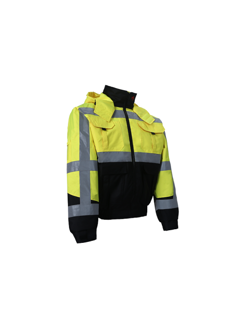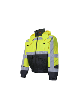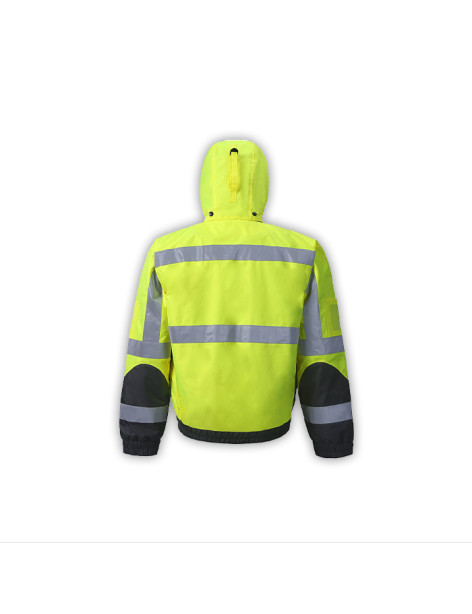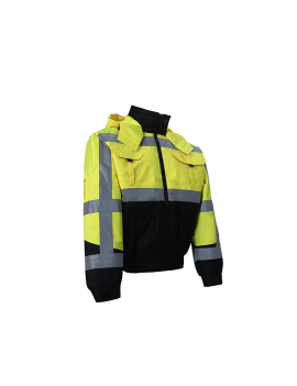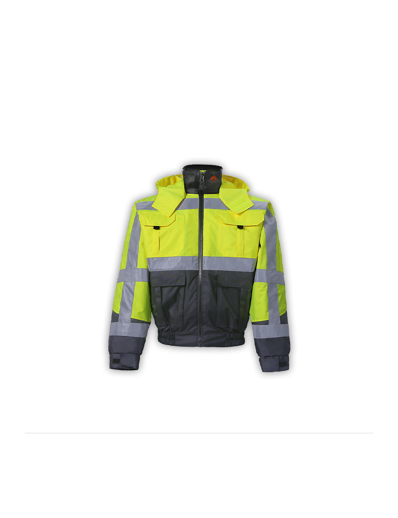 PERFORMANCE FEATURES: 2 wide reflective stripes. Heavy duty zipper front closure. Adjustable hook and loop strap on wrist cuffs. Hard hat friendly front flap on detachable hood with adjustable drawstring and stoppers. Removable zip out lining. 9 pockets total: 2 chest pockets, 2 hand warmer pockets, 1 inner cellphone/radio pocket, 2 additional inner pockets, 1 right sleeve clear ID pocket, 1 left sleeve pen/tool pocket.