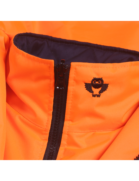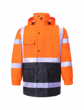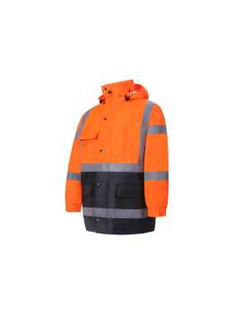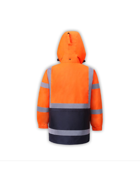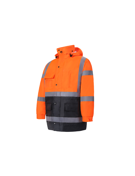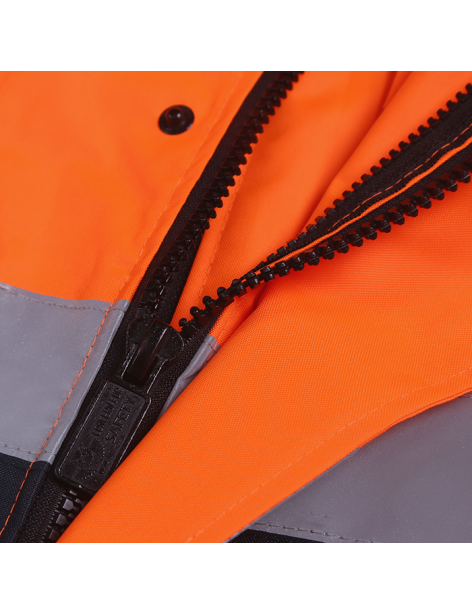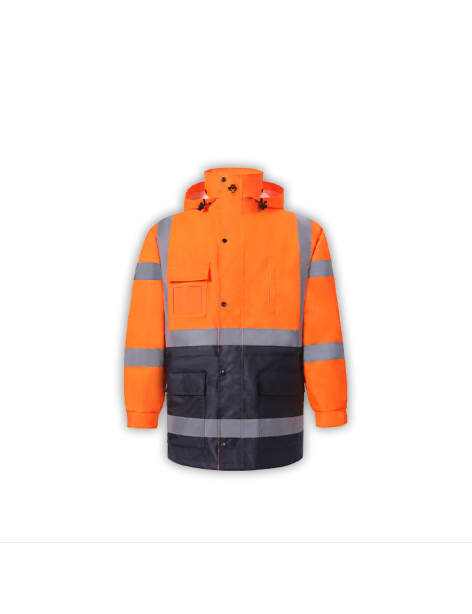 PERFORMANCE FEATURES: 2 wide reflective stripes. Heavy duty zipper front and storm flap snap closure. Adjustable hook and loop strap on wrist cuffs. Hard hat friendly attached hood with adjustable. drawstring and stoppers. 4 pockets total: 1 clear ID pocket, 1 chest pocket with zipper, 2 pockets with hook and loop closure.