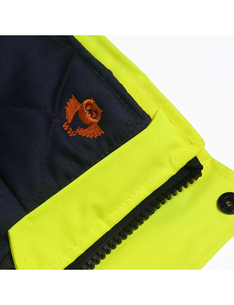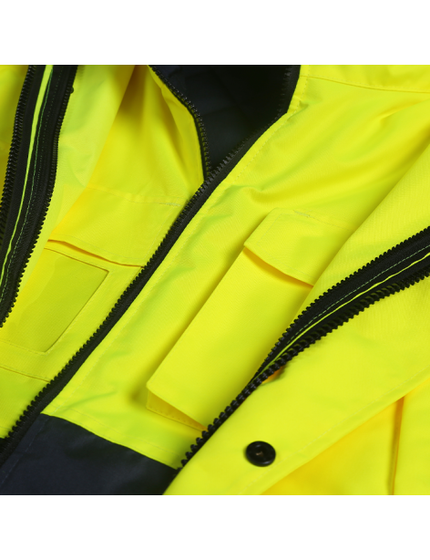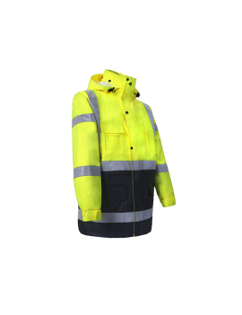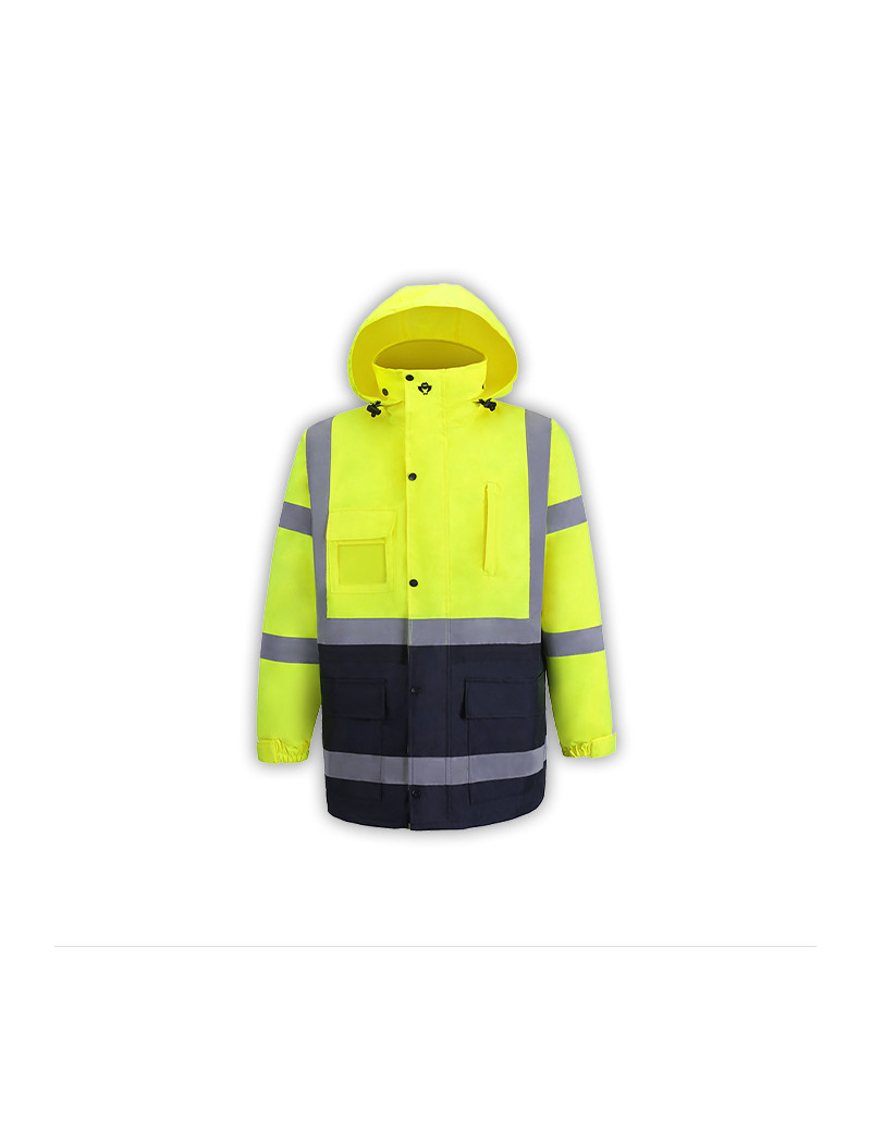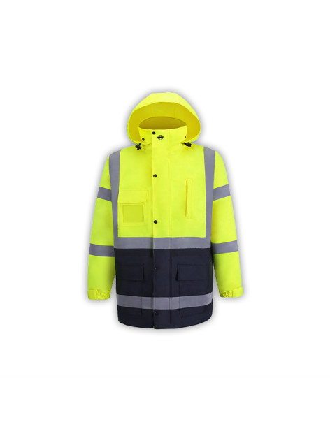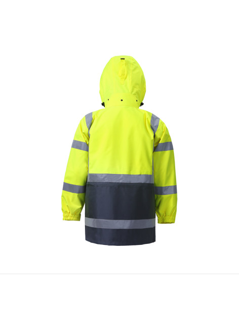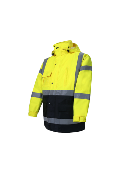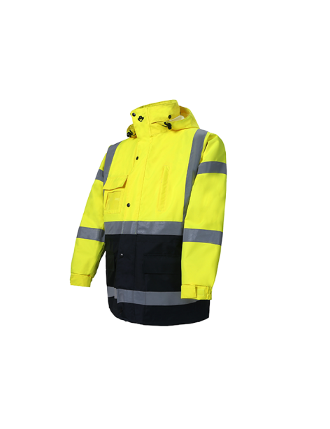 PERFORMANCE FEATURES: 2 wide reflective stripes. Heavy duty zipper front and storm flap snap closure. Adjustable hook and loop strap on wrist cuffs. Hard hat friendly attached hood with adjustable. drawstring and stoppers. 4 pockets total: 1 clear ID pocket, 1 chest pocket with zipper, 2 pockets with hook and loop closure.