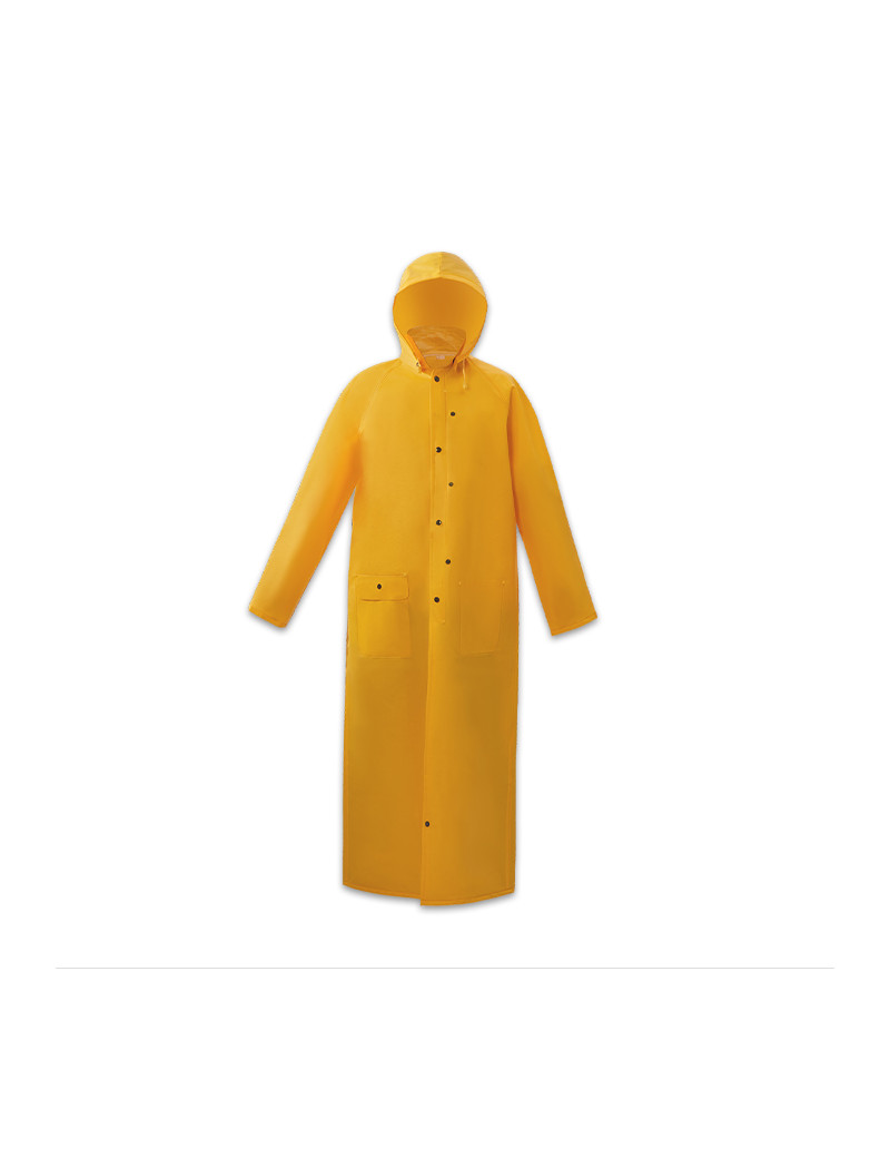 PERFORMANCE FEATURES: Long rain coat with unisex closure, detachable hood, storm-fly front with duracon snaps, and full corduroy collar for extra comfort. Coat has one outside flap pocket, one inside pocket, and cape ventilated back. Snaps on lower legs to prevent flapping.