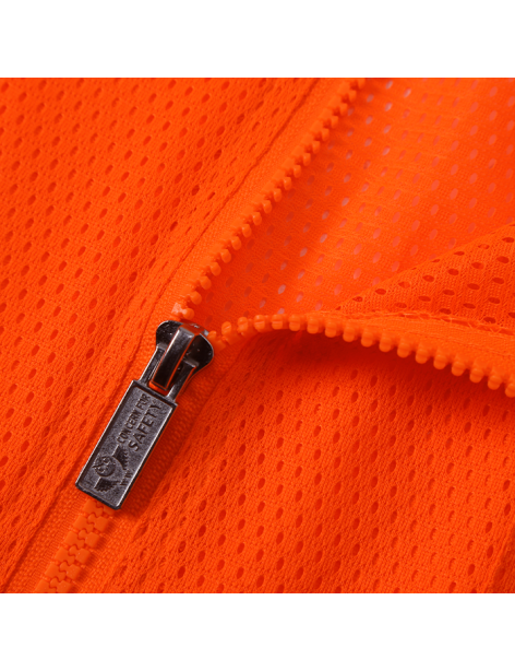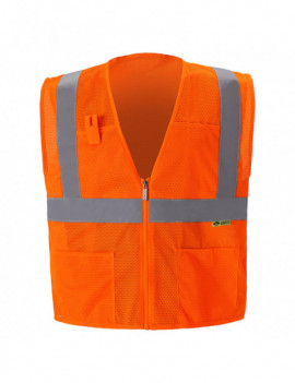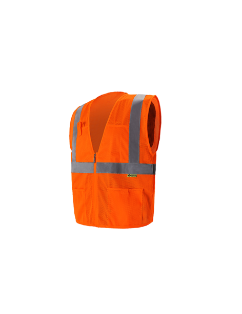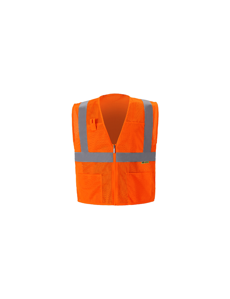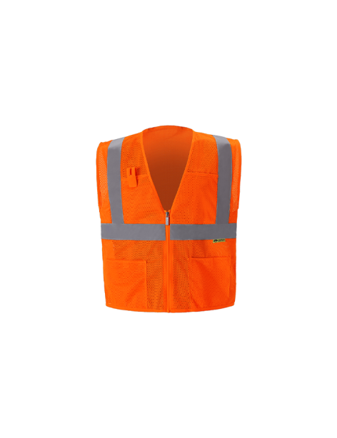 PERFORMANCE FEATURES: Zipper front closure. 2 wide reflective stripes. 4 pockets total: 2 pen/cell phone, 2 lower pockets for tools.