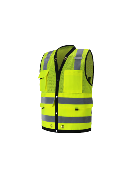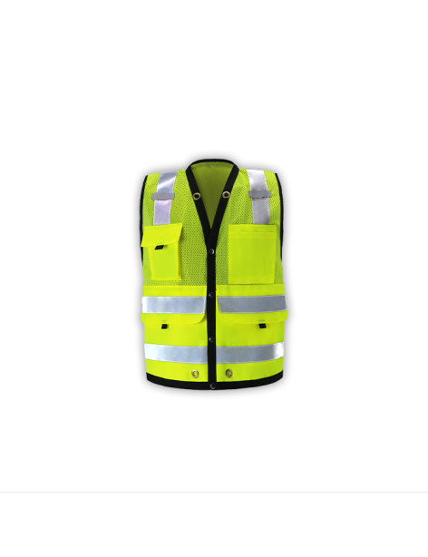 PERFORMANCE FEATURES: Snap front closure. 2 wide reflective stripes and black piping. Grommets at neck and pockets for tools and lanyard. 7 pockets total: 1 pen/tool pocket, 1 radio/cell phone pocket, 1 large back pocket for map book with snap closure, 2 large front utility pockets, and 2 large inside pockets.