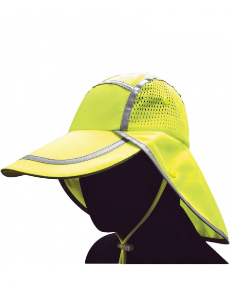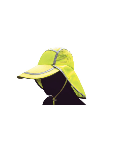 PERFORMANCE FEATURES: Adjustable hook and loop strip on back. Reflective trims. Snap-on buttons for ventilation. Large panels to protect ears and neck. ANSI certifies fabric with UV protection.